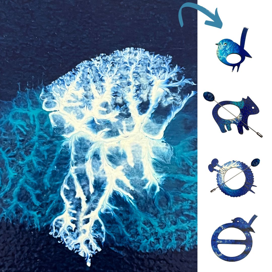 We start by UV printing original hand-painted designs onto MDF or acrylic boards. These artworks are then laser-cut into brooches, with each piece showcasing different brush strokes and paint textures—no two are exactly the same. Finished by hand and made to hold your glasses securely, they’re a perfect mix of creativity and design.