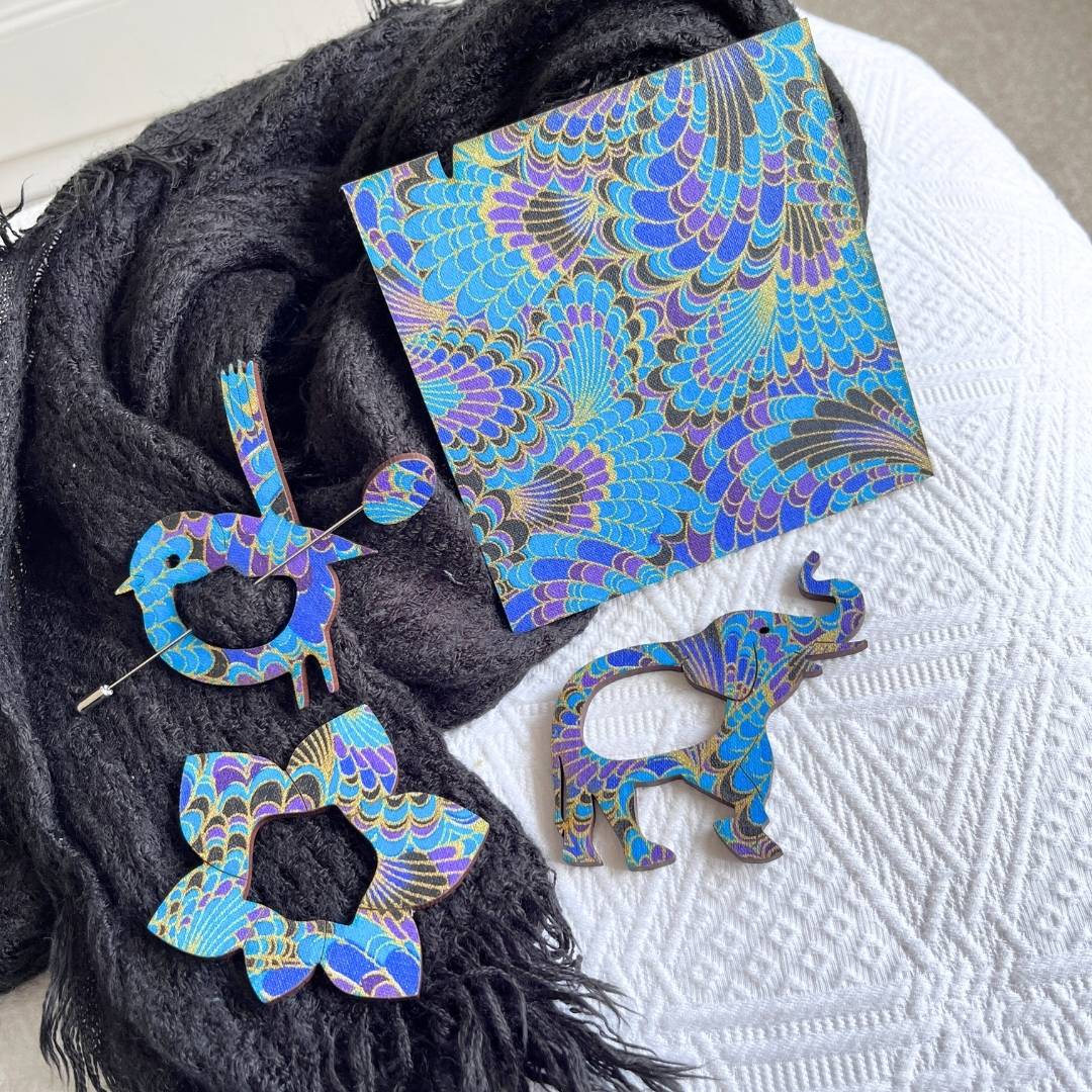 We start by UV printing original hand-painted designs onto MDF or acrylic boards. These artworks are then laser-cut into brooches, with each piece showcasing different brush strokes and paint textures—no two are exactly the same. Finished by hand and made to hold your glasses securely, they’re a perfect mix of creativity and design.